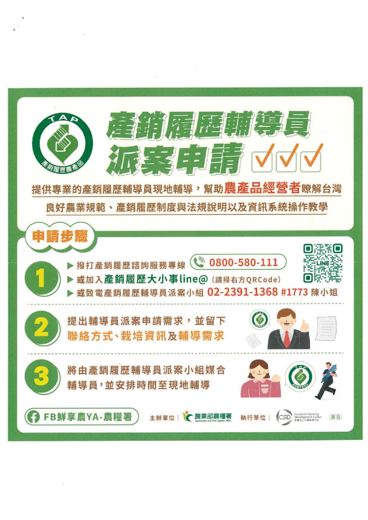 [轉知]「產銷履歷輔導員派案申請資訊」有產銷履歷驗證輔導需求者,多加利用相關輔導資源。